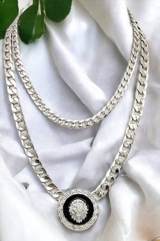 Layered Lion Head Pendant Necklace: Rhodium